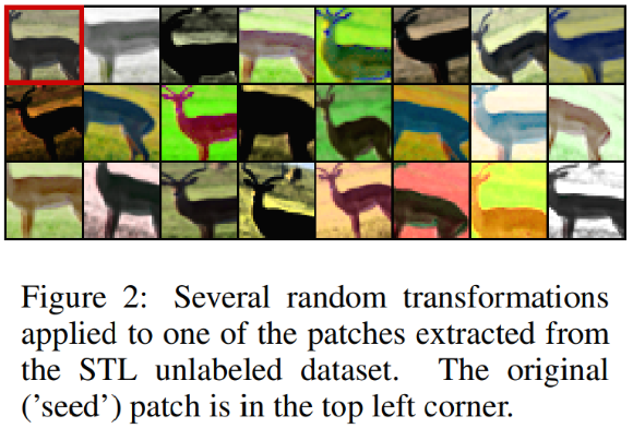 가장 왼쪽 상단 빨간색 칸 안의 사슴이 실제 original 패치이고 그 외의 것들은 random transformation을 거친 것들이다.